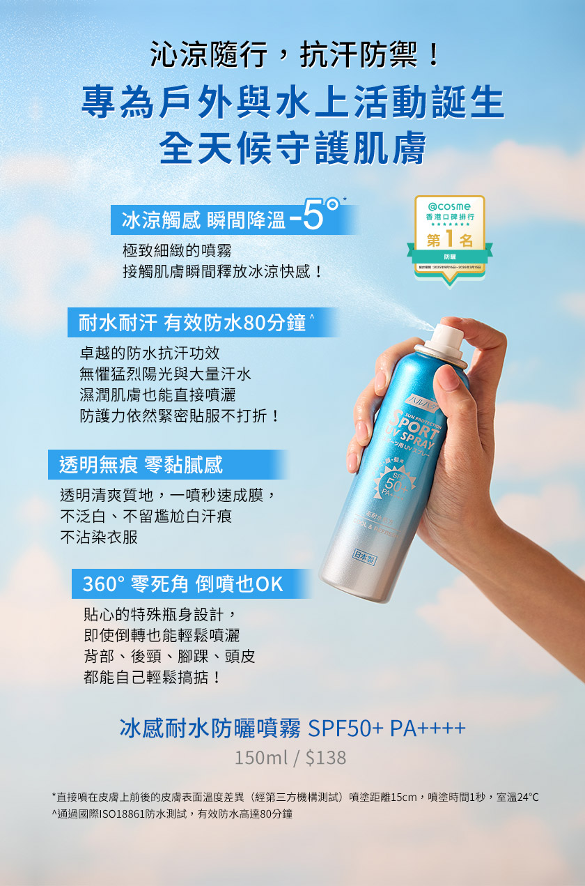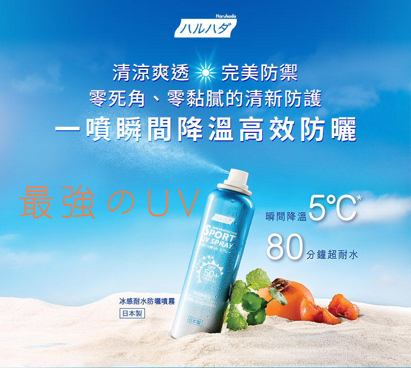 @cosme防曬排行榜NO.1!日本製HARUHADA冰感耐水防曬噴霧 SPF50+ PA++++ 瞬間降5°C 清爽又易補!