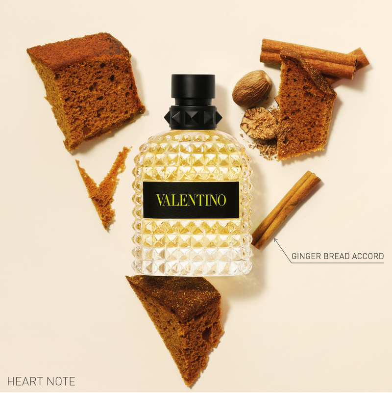 明亮、閃耀的意大利柑橋輕輕喚醒感官;墨西哥酸橙熱情、濃郁的氣息為明亮及色彩豐 富的鳳梨注入正能量。 高級訂製韻味的中調 普羅旺斯薰衣草的芳香及草本氣息與馬達加斯加天竺葵,跟Uomo 香水的清新及明亮形成對比,繼而引領出薑餅香氣。肉桂、豆蔻及 肉豆蔻為薑餅添上煙熏及東方香調,營造細緻的誘惑感覺。這溫暖 的基調向Valentino男士的慷慨致敬。