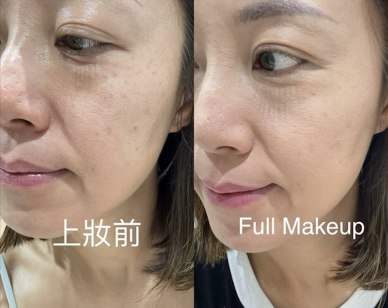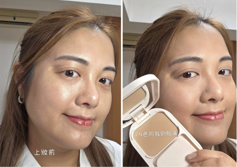 shirley 將粉撲沾濕,再均勻推開上妝,並大讚妝感:「上妝後,感覺比乾拍上去更貼膚,一拍柔焦,而且遮瑕度更強,修飾毛孔瑕疵之餘,黑眼圈亦明顯變淡。帶妝4個鐘後,都keep到妝效,而且與少量油光融入後,可見柔焦而有光澤感,濕上效果不錯。如簡單出街食飯,又唔想咁頹落街嚇親人 (haha),我會用呢盒粉餅,可以快速均勻膚色;如化妝後,會帶呢盒出街補妝用。」