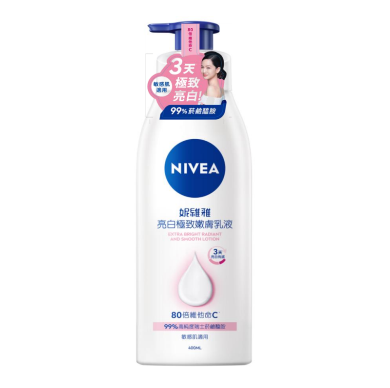 NIVEA 亮白極致嫩膚乳液NIVEA皇牌美白乳液的新升級版本!上一代的美白緊緻修護潤膚露曾榮獲2023香港美妝大賞身體保養第3名,新版本成份升級,加入更強美白成份,為你帶來全"身"美白體驗!配方質地水潤輕盈易吸收,不含酒精、色素、礦物油、PARABEN類防腐劑、 防曬劑,同時適用於所有膚質,包括敏感肌!