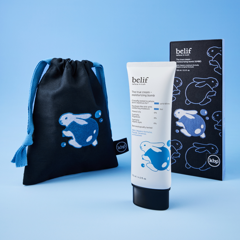 都巿人生活節奏急促,容易壓力過大,加上作息不定時及環境污染,令肌膚長期緊蹦缺水,出現暗沉、鬆弛等疲倦肌症狀。belif 皇牌紫芹48hr潤澤炸彈霜配方針對舒緩乾裂不適的肌膚,保濕同時修復肌膚;於今年更特別聯乘 韓國人氣印花品牌 kittybunnypony (KBP®) 推出 紫芹48hr潤澤炸彈霜增量禮盒(kittybunnypony聯乘特別版)! KBP®經典角色Happy Bunny化身補水速遞員,背著belif水分營養四處跳躍,為缺水肌膚即時快速補水,重新注入活力!特別版炸彈霜容量更增加至2.5倍,同時附贈限定Happy Bunny刺繡束口袋,絕對是送禮自用的最佳選擇!