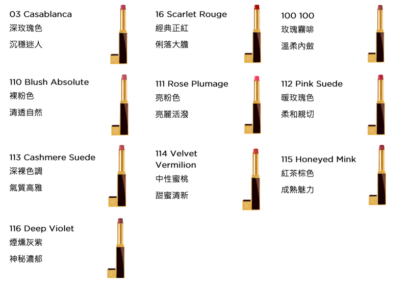 系列共推出 10 款可自由疊擦的柔霧色調,質地輕盈,易於上手,靈感來自 TOM FORD 伸展台上的性感與優雅。色調細膩耐看,個性鮮明,無論是日常妝容或重要時刻,都能展現獨特的迷人氣息。唇膏外型採用俐落的黑金細管設計,線條精緻洗鍊,散發低調而獨特的奢華品味,是一款隨身攜帶也能展現品味的魅力單品。