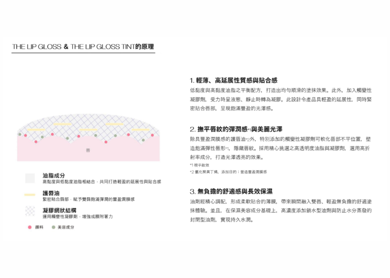 唇彩帶來的精致光澤與夢幻朦朧的魅力,更突顯獨特個性。添加兩種大小不同透明質酸成分,持久保持水潤效果。
