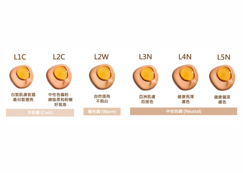 經過精心調配,兼顧各種肌膚色系、色調專為亞洲膚色推出六大完美色號。