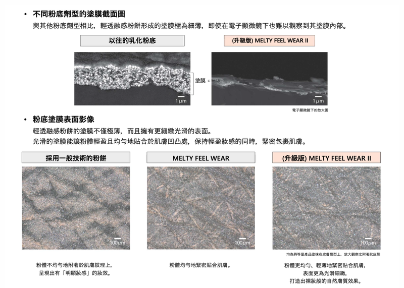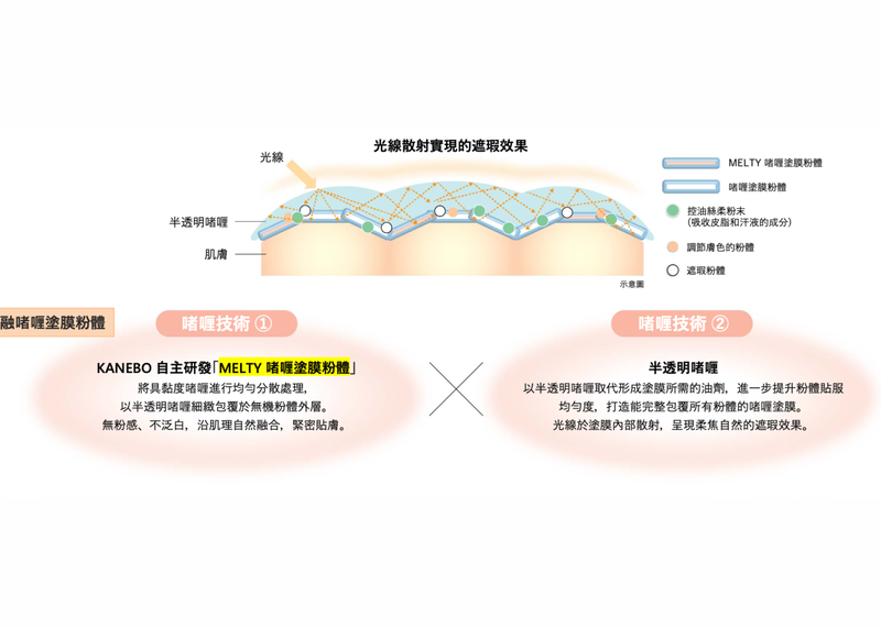 全新添加「MELTY 啫喱塗膜粉體」,由啫喱包覆,粉體相⽐以往1更為輕薄透明,可輕盈順滑延展。細緻緊密貼合肌理凹凸,實現如融⼊肌膚般的⽔潤舒適妝感,同時提升塗膜透明度。結合更能減輕泛⽩、細膩修飾肌膚的啫喱塗膜粉體,充分利⽤裸肌原有⾊澤,提升塗膜內部光線散射效果,均勻調節肌膚整體⾊調與質感,實現卓越⾃然的遮瑕效果。