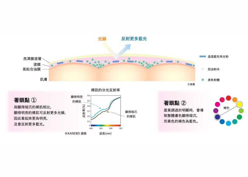 並⾮依靠遮瑕顏料來提升膚⾊,⽽是利⽤能選擇性反射藍光的晶透藍⾊珠光粉中所含的藍光特性,增添肌膚透亮感,呈現⾃然提亮、不泛⽩的妝效。