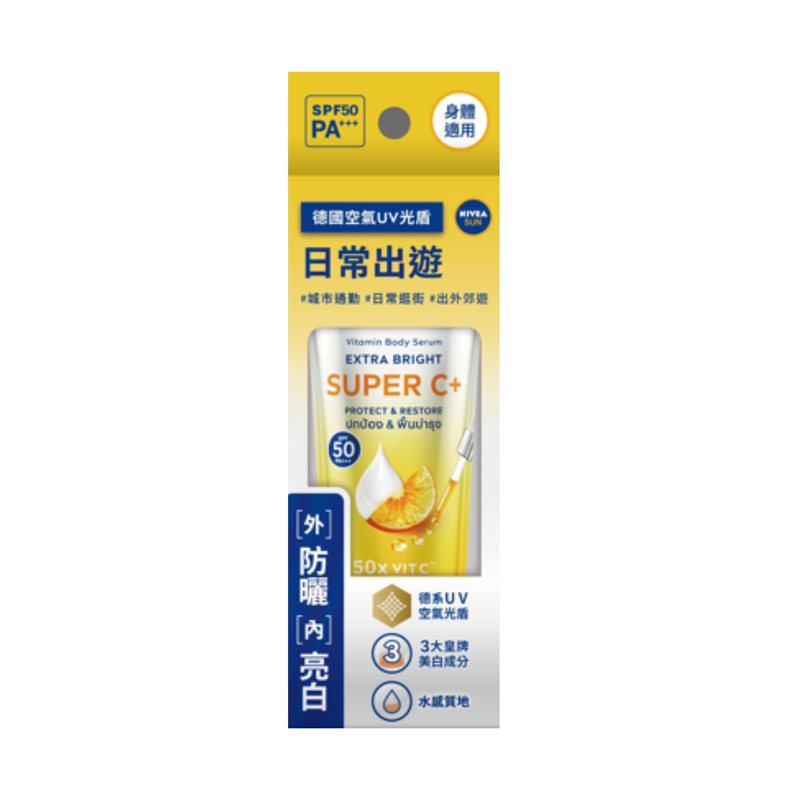 NIVEA 果萃雙效SUPER C+ 防曬精華凝乳 將專研空氣光盾防曬技術與三大皇牌美白成分融於一瓶。一抹之間,兼得可靠UV防護與透亮光采,輕盈質地讓肌膚倍感舒適。