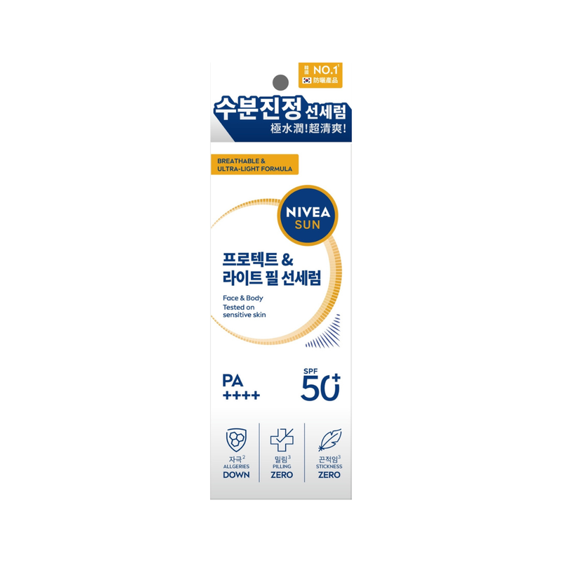 輕盈卻強效的全面防護之選。NIVEA羽感防曬水凝乳為面部與身體提供高防曬保護力,透氣不悶痘,不堵塞毛孔。經敏感肌測試,採用低敏配方,溫和可靠。NIVEA韓國No.1防曬產品 – 讓您每日輕鬆享受無重感防護。