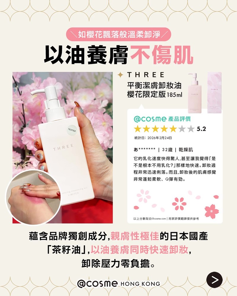 ✦ 𝐓𝐇𝐑𝐄𝐄 平衡潔膚卸妝油 櫻花限定版