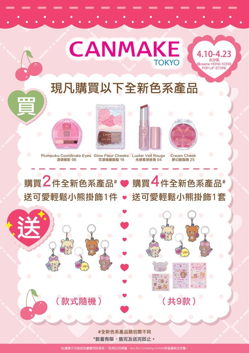 Beauty Lovers 最愛的日系妝容必備好物 CANMAKE 登陸 @cosme HONG KONG,全新 POP UP 可愛揭幕! 今次 CANMAKE TOKYO 彩妝系列出了一系列春日甜美新色,更有日本人氣插畫 Rilakkuma 輕鬆小熊,帶領 Beauty Lovers 一起找到專屬於你的可愛秘密!活動更有眾多皇牌美妝好物的獨家優惠,以及超可愛 POP UP 打卡區,一定要來!