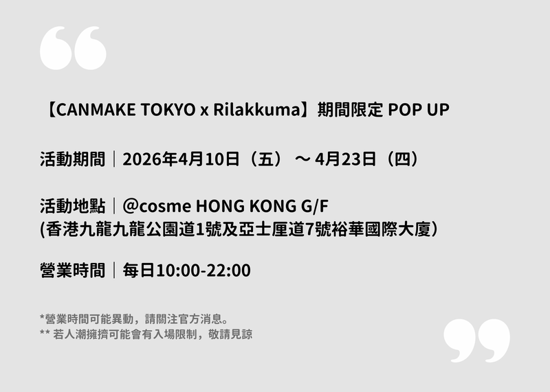 @cosme 旗艦店 x CANMAKE x Rilakkuma POP UP - 最萌日系彩妝快閃降臨香港!超甜優惠一次看/CANMAKE TOKYO