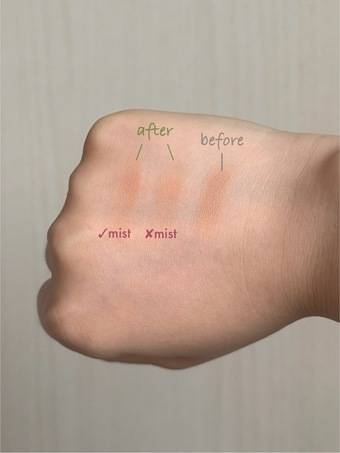 使用後,脫妝和口罩沾粉的情況皆有改善,口罩內的粉痕明顯減少,但又未至於完全沒有 。我把遮瑕膏畫在手上,圖中右邊的是原來的狀況,左邊和中間則是在有和沒有噴霧的情況下各拭五下,可見沒有噴霧的遮瑕膏已化開,而有噴霧的雖然也有少許化開,但仍能維持一定的顏色和完整度 。