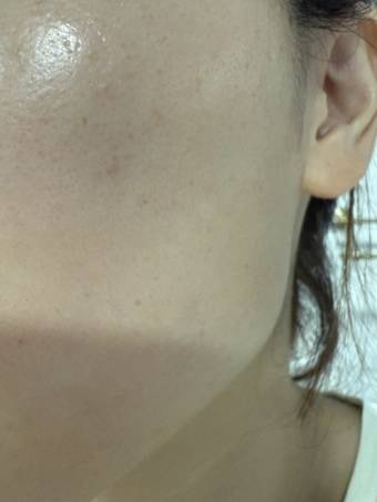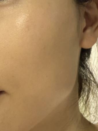 圖二:上妝後。用粉底掃上妝輕易掃開, 已經感覺到粉底柔霧, 用海綿印開, 自然貼服。遮瑕度中等,明顯遮到毛孔及斑印,膚色均勻平滑。