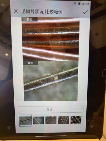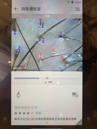 職員消毒專業儀器,再將專業儀器以放大60倍去拍攝再分析頭皮狀況,從而了解自己頭皮既Thickness 濃密度、Hair cuticle 毛鱗片、Hair loss 脫髮、Redness 敏感。可見Thickness 濃密度有改善,有短短幼幼既新毛髮生左出黎,職員建議我要繼續給營養比頭皮/毛囊,新生既毛髮就會強韌健康。