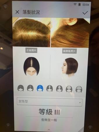 落髮等級III,主要係頭頂及分界位置,職員估到我條髮界分左好多年,髮界中間位置有輕微落髮狀況,職員分析頭頂位置經常受太陽照射及紫外線既傷害,建議我盡量定期轉換髮界線及留意紫外線對頭皮既傷害。